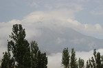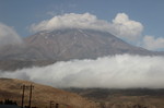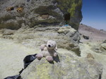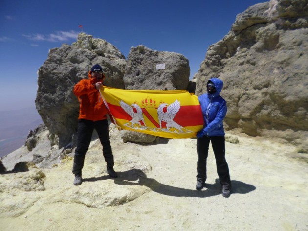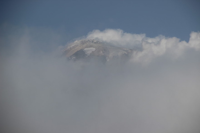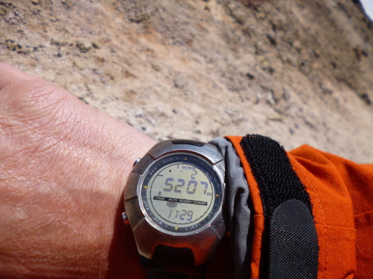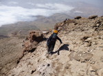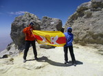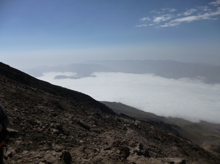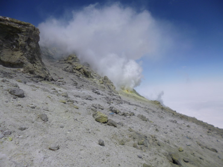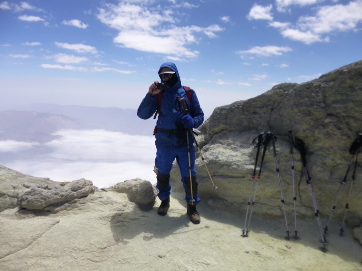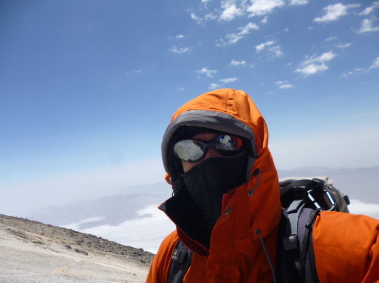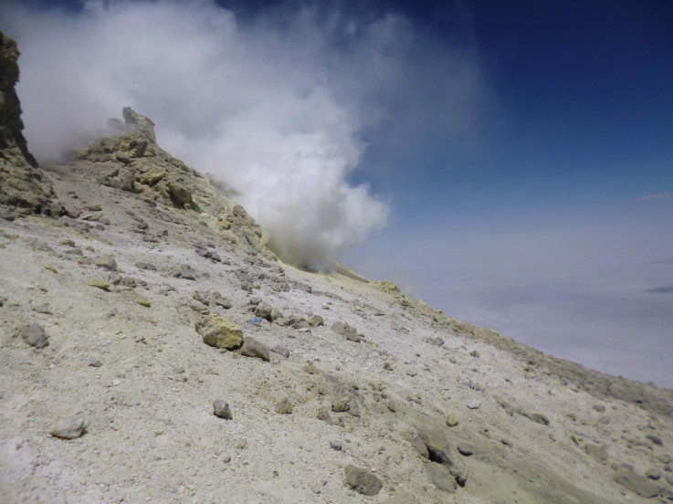 Es stehen heute mehr als 1.500 anstrengende Höhenmeter im Auf- und Abstieg an. Wir frühstücken etwas und gehen los. Langsam gleichmäßig geht es aufwärts, regelmäßige Pausen und viel trinken ist die Devise. Unterwegs werden wir von zwei iranischen Bergsteigern eingeholt. Der ältere von beiden hat einen Arm im Gips, im anderen hält er ein Kofferradio. Die beiden Typen sind unglaublich. Sie plaudern mit uns, versorgen Edith und mich mit Essen und machen Pause wenn auch wir stehen bleiben. Ich spüre die Höhe, der Schwefelgestank wird mit zunehmender Höhe immer unerträglicher. Ständiger Würgereiz und brennende Augen kommen zu den ohnehin unangenehmen Auswirkungen der Höhe. Die letzten 300 Höhenmeter werden für mich zu einer echten Quälerei. Edith kämpft sich tapfer hoch und versucht mich zu motivieren. Zirka 150 Meter unter dem Gipfel verabschieden sich unsere beiden iranischen Freunde und ziehen in einem unglaublichen Tempo davon. Ich kämpfe mit den Symptomen der Höhenkrankheit, gegen den Schwefelgestank und zweifle kurz daran, den Gipfel erreichen zu können. Jetzt umdrehen wäre so einfach. Ich bitte Edith weiterzugehen und quäle mich hoch zum Gipfel. Etwa 10 Minuten nach Edith komme ich oben an. Ich bin unendlich froh, dass ich es geschafft habe. Wir gratulieren uns und es werden die üblichen Gipfelfotos geschossen. Vorbei an einer entsetzlichen stinkenden Fumarole, aus der unaufhörlich eine gewaltige Schwefelgasfontäne ausgestoßen wird, geht es wieder in Richtung Lager III.