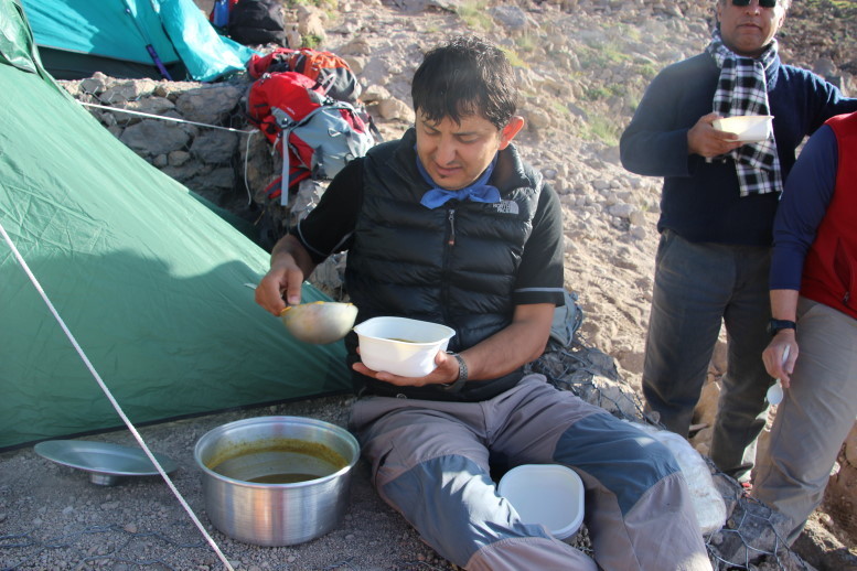 Am Tag darauf geht es per Geländewagen ins Lager II, Gūsfandsara auf ca. 3.000m. Hier wird das Gepäck auf Muli‘s umgeladen. Zu Fuß geht es auf 4.180m, ins Lager III. Hier steht die Berghütte Barga-e-Sevom, eine großes Steinhaus, etwas oberhalb der alten, bunkerartigen Hütte. Hier kann man seine Mahlzeiten zubereiten lassen, einnehmen und auch übernachten. Wir ziehen die Übernachtung ca. 50 Höhenmeter tiefer, in unseren eigenen Zelten vor. Nachteil, wenn man auf die Toilette muss oder zur Hütte will, hat man immer einen kleinen aber anstrengenden Aufstieg zu bewältigen. Wir richten unser Lager ein, bauen die Zelte auf und ich kann noch einige Tipps und Tricks zur Einrichtung der Unterkunft los werden. Am Abend wird gegessen, gesungen und gelacht. Ich steige noch mit einem Teil der Gruppe ca. 150 Höhenmeter auf und verweile dort, bis es uns zu kalt wird. Dann geht es zurück zum Zelt und wir verbringen die erste Nacht in dieser Höhe. Der Atem und der Puls gehen schon etwas schneller und an- und ausziehen dauern auf 4.200m Höhe einfach länger als sonst.