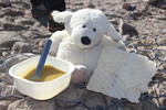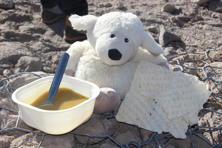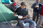 Am Morgen haben Edith und ich gar keinen richtigen Bock uns aus dem warmen Schlafsack zu quälen. Irgendwann sitzen wir in der Daunenjacke neben dem Zelt, genießen die ersten warmen Sonnenstrahlen des Tages und löffeln unsere Linsensuppe. Es schmeckt und wärmt, trotzdem ist es etwas gewöhnungsbedürftig, Linsensuppe zum Frühstück. Wir richten unsere Rucksäcke für eine Tagestour und steigen bis über 4.820m.